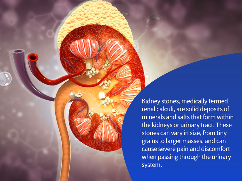 Kidney stones, medically termed renal calculi, are solid deposits of minerals and salts that form within the kidneys or urinary tract. These stones can vary in size, from tiny grains to larger masses, and can cause severe pain and discomfort when passing through the urinary system.